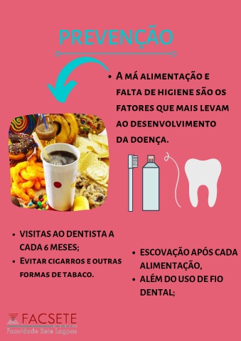 PREVENÇÃO A má alimentação e falta de higiene são os fatores que mais levam ao desenvolvimento da doença. VISITAS AO DENTISTA A CADA 6 MESES; ESCOVAÇÃO APÓS CADA Evitar cigarros e outras ALIMENTAÇÃO, formas de tabaco. ALÉM DO USO DE FIO DENTAL;