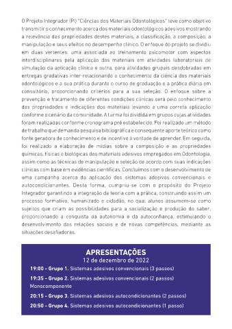 O Projeto Integrador (PI) “Ciências dos Materiais Odontológicos” teve como objetivo