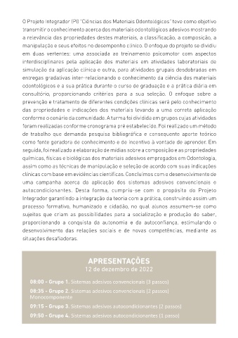 O Projeto Integrador (PI) “Ciências dos Materiais Odontológicos” teve como objetivo
