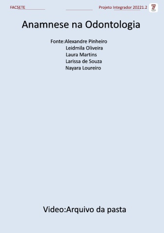 FACSETE Projeto Integrador 20221.2 Anamnese na Odontologia Fonte:Alexandre Pinheiro Leidmila Oliveira Laura Martins Larissa de Souza Nayara Loureiro Video:Arquivo da pasta