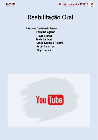 FACSETE Projeto Integrador 20221.2 Reabilitação Oral Autores: Daniela de Paula Carolina Aguiar Flavia Freitas Lyvia Barbosa Maria Eduarda Ribeiro Reuel Santana Tiago Lopes Video: https://youtu.be/EU_mLJ6qYF0?t=8
